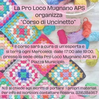 Da novembre 2023, ogni giovedì fino a data da destinarsi si tiene il” corso di uncinetto” presso la sede della Pro Loco Mugnano APS.Partecipanti di tutte le età si riuniscono per imparare le tecniche dell’uncinetto, creando insieme opere creative e condividendo momenti di socializzazione.