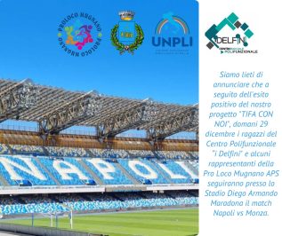 Grande iniziativa della Pro Loco Mugnano APS, che ha permesso ai ragazzi del centro Polifunzionale ” I Delfini” di vivere  l’emozione dello stadio e di sostenere la squadra del cuore, durante il match Napoli vs Monza presso lo stadio Diego Armando Maradona.